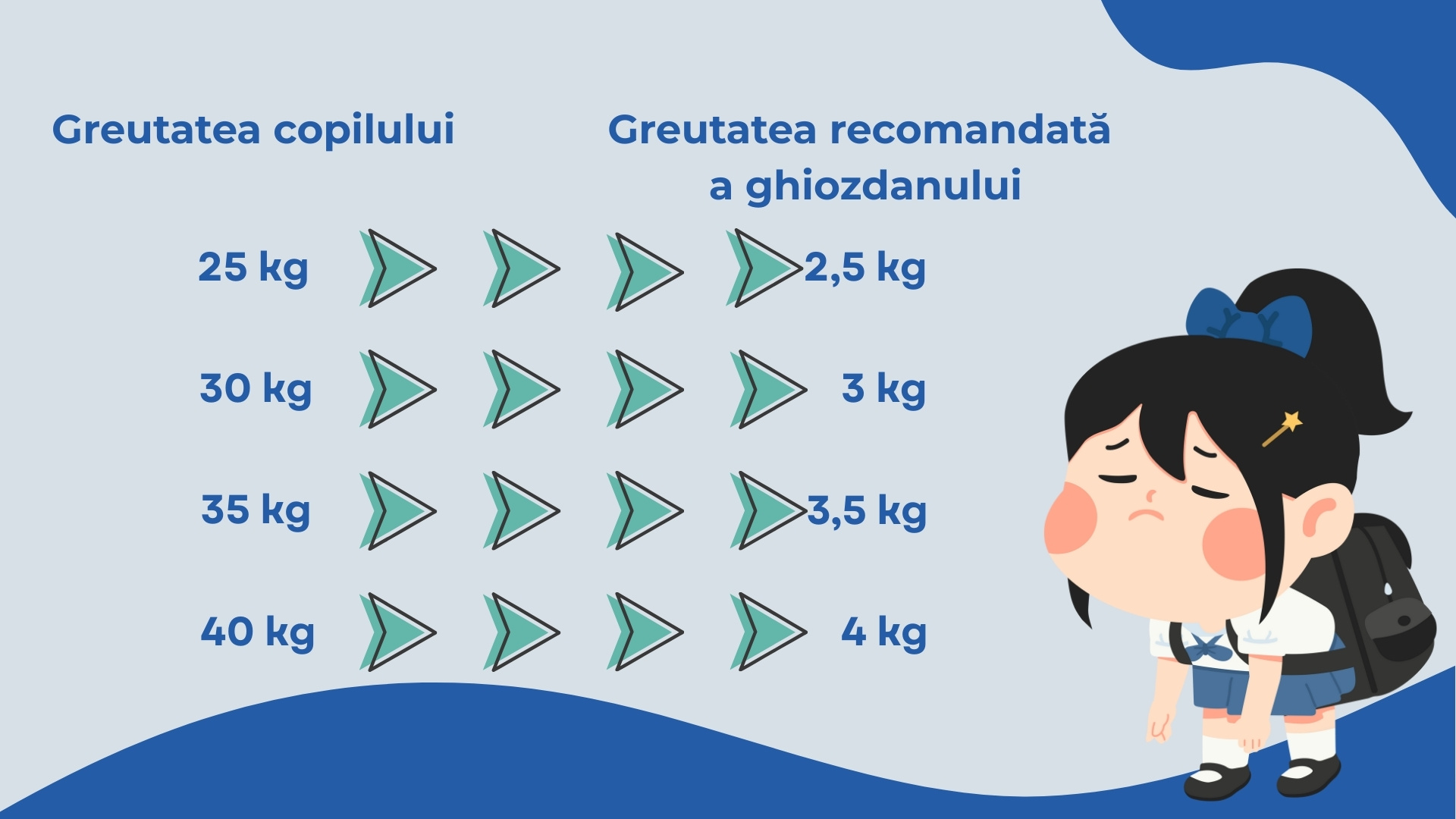 Alimentație sănătoasă, rutine de somn, dezvoltare cognitivă și multe altele.Pentru milioane de copii din România, ghiozdanul face parte din rutina zilnică. Însă, atunci când este prea greu, el poate deveni o adevărată povară pentru sănătate. Specialiștii atrag atenția că ghiozdanele care depășesc 10-15% din greutate corporală a copilului pun în pericol dezvoltarea corectă a coloanei vertebrale și a musculaturii.